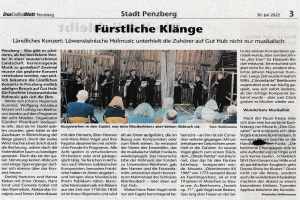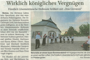 "Einen vergnüglichen Sommerabend erlebten die zahlreichen Besucher beim Konzert der Fürstlich Löwensteinischen Hofmusic im stilvollen Pfedelbacher Schlosshof.