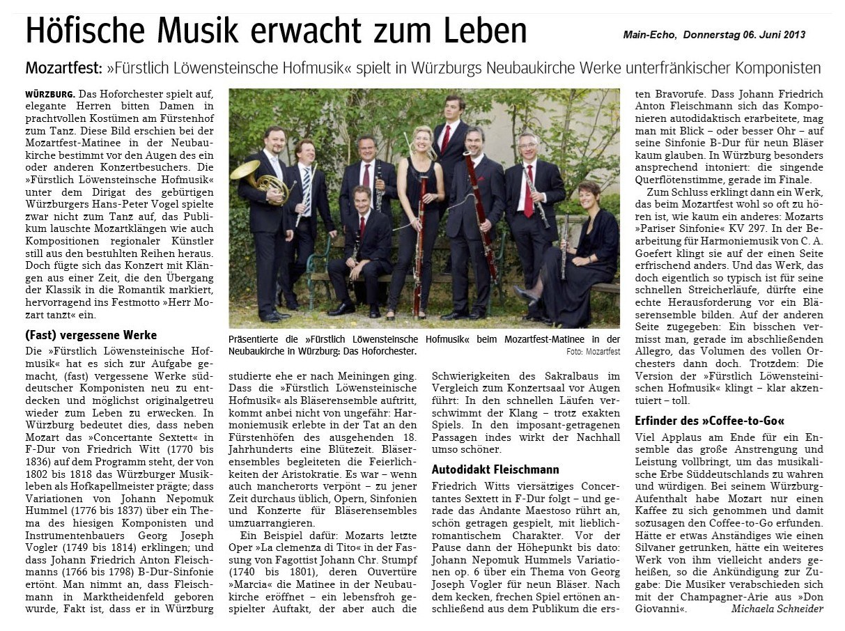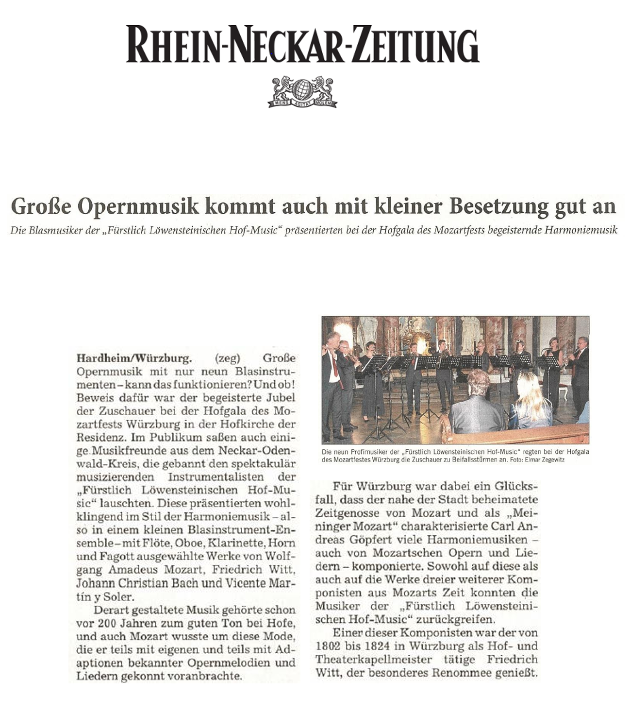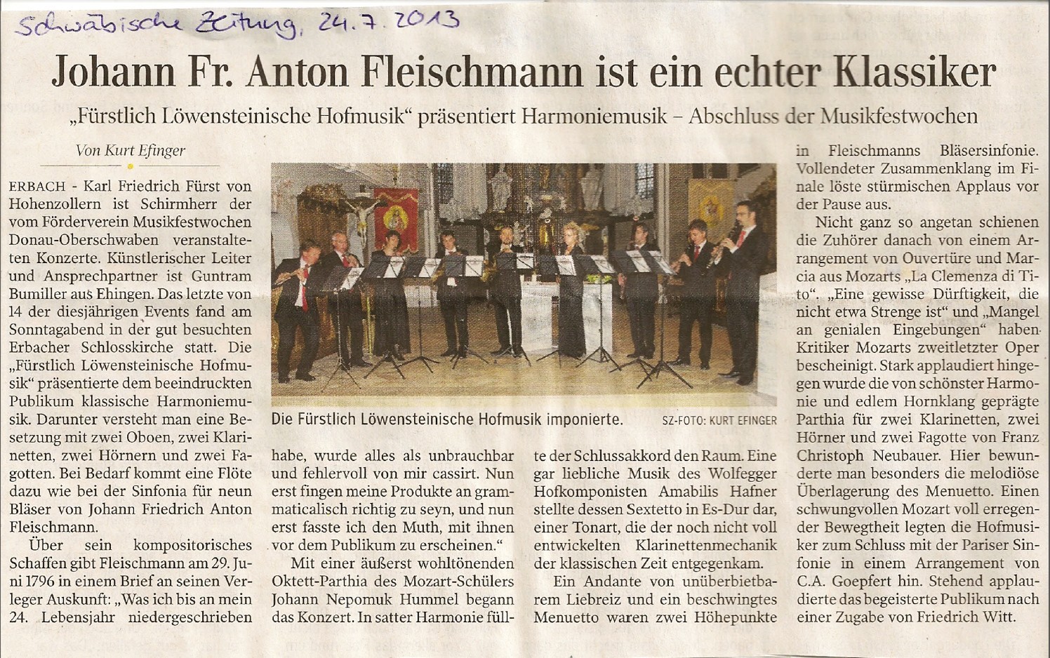 "Neun hochklassige Bläser brachten zwei eng mit Niederstetten verwobene Komponisten wieder zurück in die Heimat - teilweise nach 200-jährigem Archivschlummer entstaubt und blank poliert."