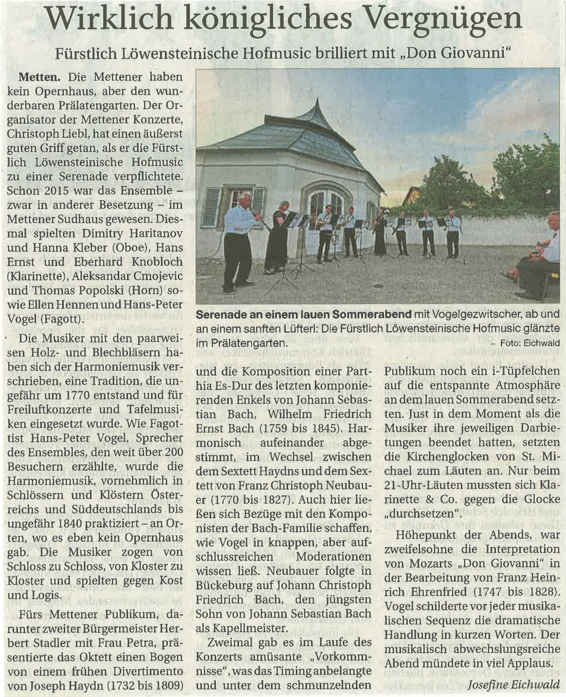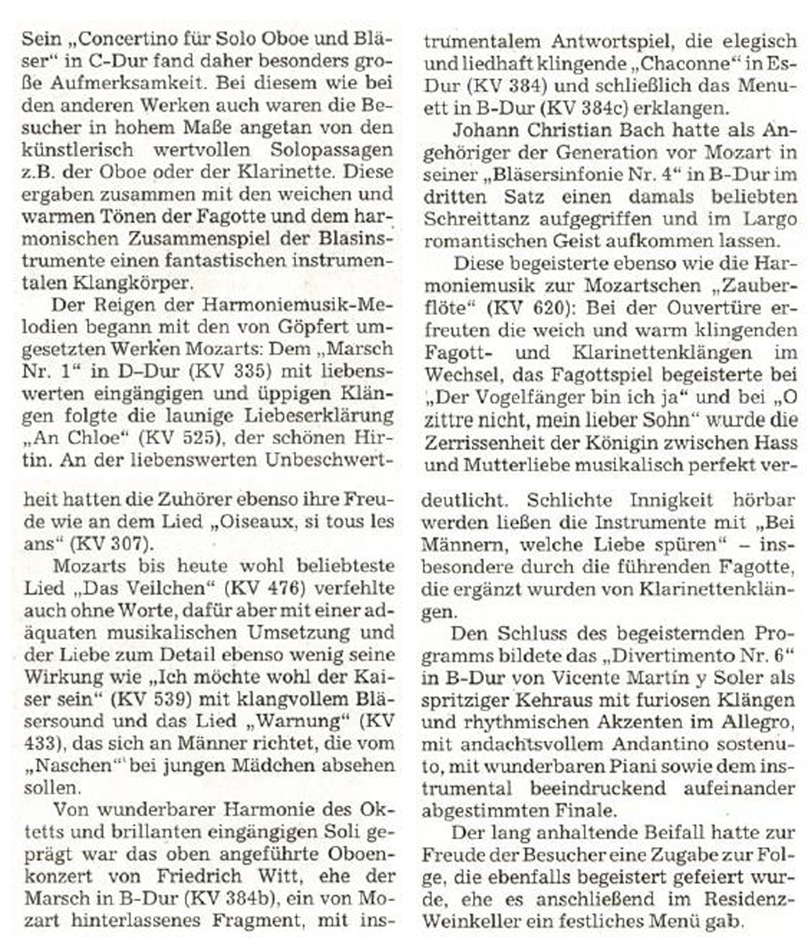 Mit Musik, wie sie an den süddeutschen Fürstenhöfen im 18. Jahrhundert gepflegt wurde, erfreute das Ensemble, wobei seine spürbare Spielfreude und die launige Moderation des leitenden Fagottisten Hans-Peter Vogel das Vergnügen noch steigerte."